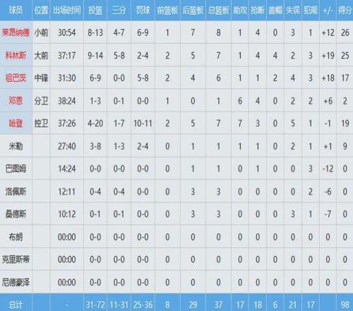 此役科林斯乃快船的最大赢球功臣,首发出战约37分钟,投篮14中9,其中三分球8中5,罚球4中2独揽25分7板1助4断4帽全面数据,正负值+19全场最高。快船队记Azarly对此表示,科林斯是有数据统计以来,首位单场25分&命中5记三分并送出4断4帽的球员。